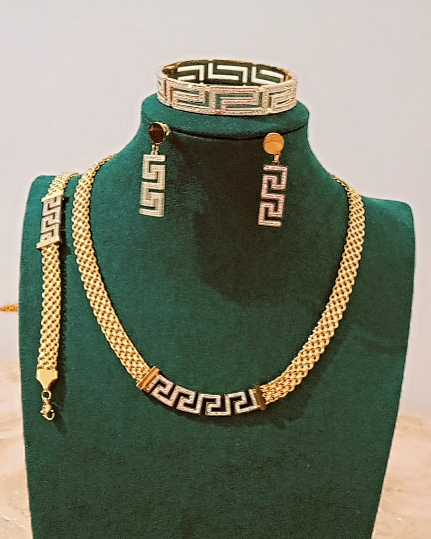 Découvrez la Parure Fandy quatre pièces, une magnifique collection composée d’un collier, d’une gourmette, d’une paire de boucles d’oreilles et d’un bracelet rigide. Chaque pièce est conçue en acier inoxydable doré avec des motifs géométriques modernes et des détails finement travaillés pour une élégance intemporelle.