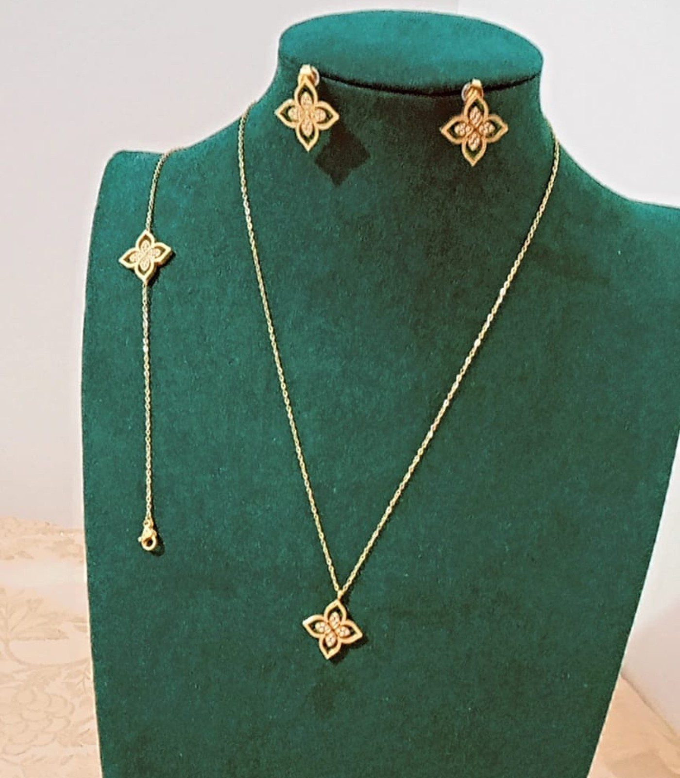 Parure LV doré en acier inoxydable – Élégance dorée, résistante à l’eau, et intemporelle.
