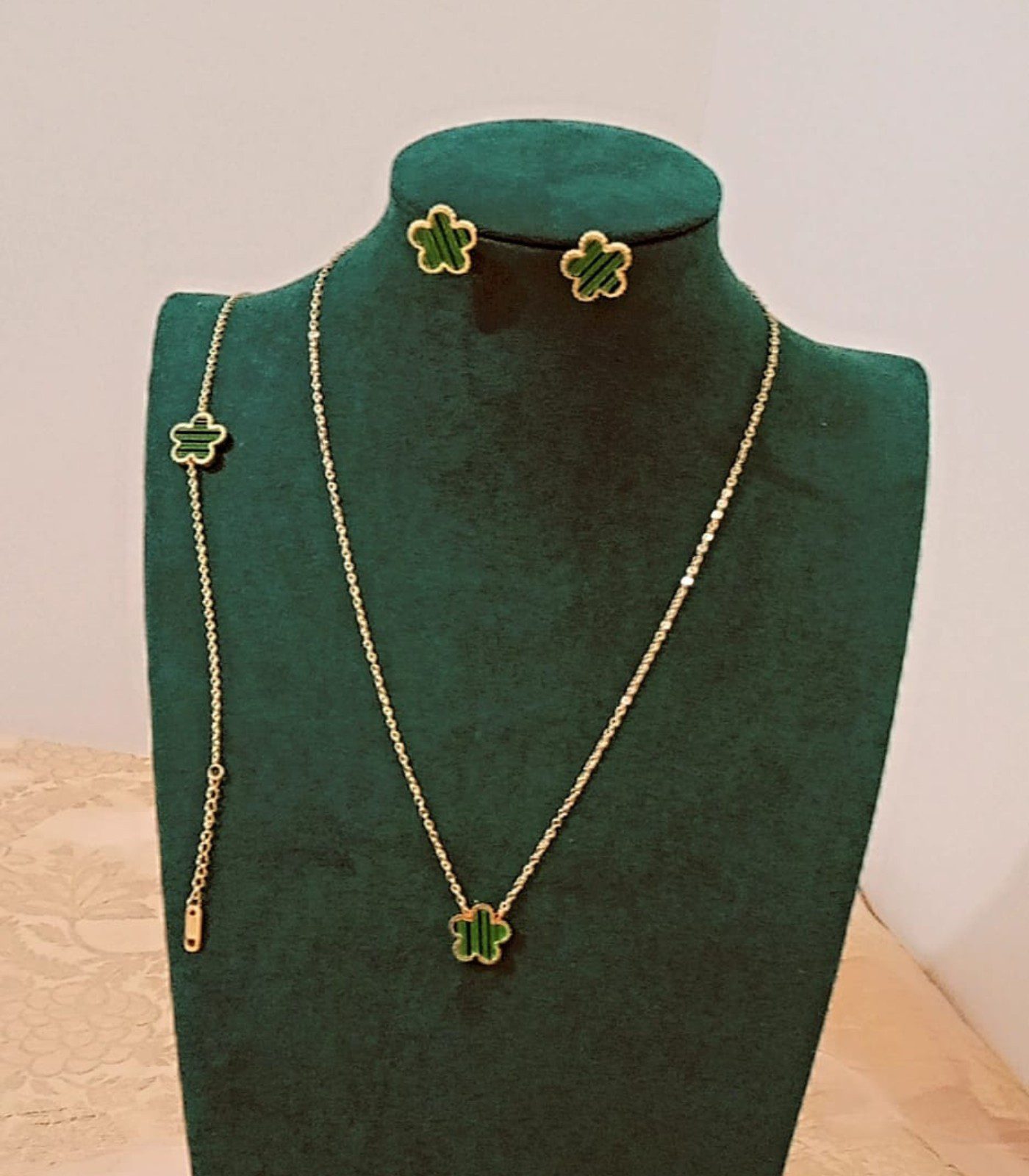 Parure trèfle vert à trois pièces en acier inoxydable – Élégante, résistante à l’eau, symbole de chance et de prospérité.